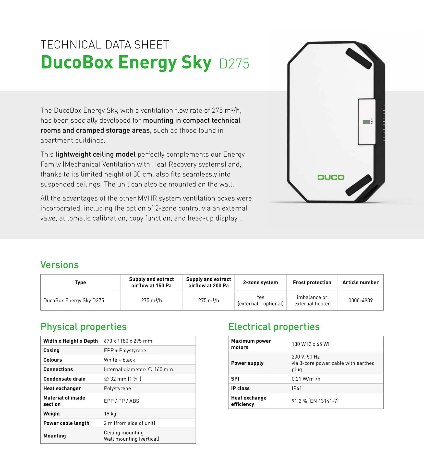 Discover the DucoBox Energy Sky - the ventilation solution for compact spaces with a ventilation flow rate of 275 m³/h. With a height of just 30 cm and a light weight of 19 kg, the placement options are flexible.
