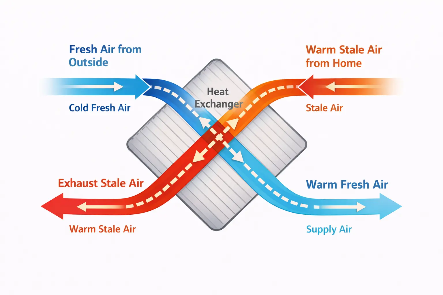 The extracted warm air passes through one side of a heat exchanger core, while incoming cold air passes through the other side. Heat transfers across thin plates inside the exchanger, but the two air streams never mix. Because of this exchange, the system recovers heat that would otherwise be lost with the outgoing air.